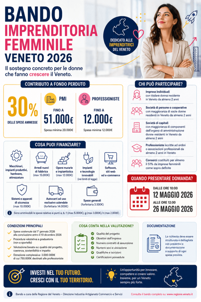 La Regione Veneto ha attivato per il 2026 un bando dedicato al sostegno dell’imprenditoria femminile, con l’obiettivo di incentivare gli investimenti e la crescita delle imprese guidate da donne. Si tratta di una misura concreta, che mette a disposizione contributi a fondo perduto per finanziare progetti di sviluppo aziendale. Il contributo copre il 30% delle […]